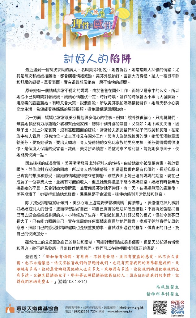 陳潔芝醫生說,有人或會將配偶作為自己的情緒發洩對象,這想法是錯的,也容易產生婚姻問題。夫妻需要互相尊重,當出現情緒時要自我處理。「我們的內心都明白自己不開心時需要怎樣做。我自己不開心時,會以哭的方式去接觸自己當刻的不快感受,『上帝啊!我現在很不開心,求袮幫助我!』向神祈禱,講出自己的感受,對舒緩情緒是最有效的。」