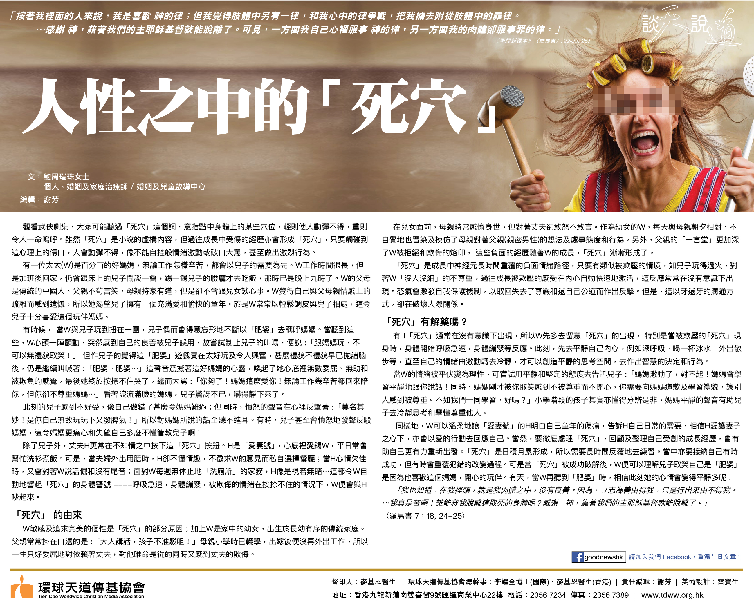 觀看武俠劇集,大家可能聽過「死穴」這個詞,意指點中身體上的某些穴位,輕則使人動彈不得,重則令人一命嗚呼。雖然「死穴」是小說的虛構內容,但過往成長中受傷的經歷亦會形成「死穴」,只要觸碰到這心理上的傷口,人會動彈不得,像不能自控般情緒激動或破口大罵,甚至做出激烈行為。