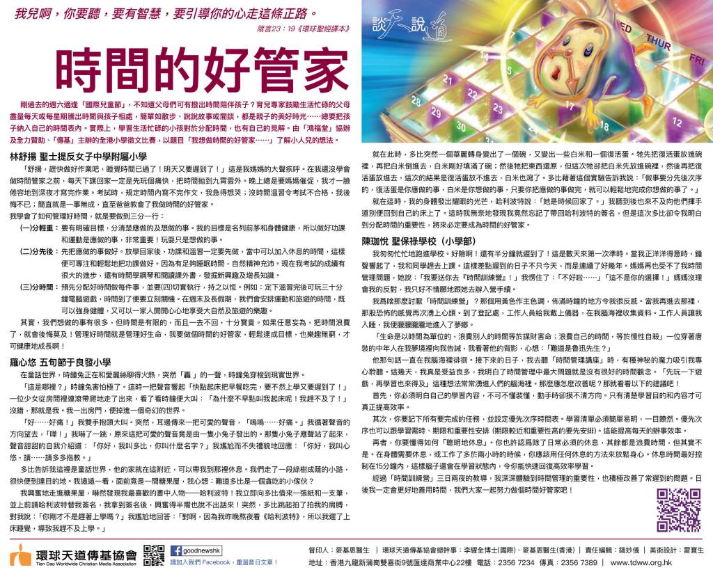 剛過去的週六適逢「國際兒童節」,不知道父母們可有撥出時間陪伴孩子?育兒專家鼓勵生活忙碌的父母盡量每天或每星期騰出時間與孩子相處,簡單如散步、說說故事或閒談,都是親子的美好時光……總要把孩子納入自己的時間表內。實際上,學習生活忙碌的小孩對於分配時間,也有自己的見解。由「鴻福堂」協辦及全力贊助、「傳基」主辦的全港小學徵文比賽,以題目「我想做時間的好管家……」了解小人兒的想法。