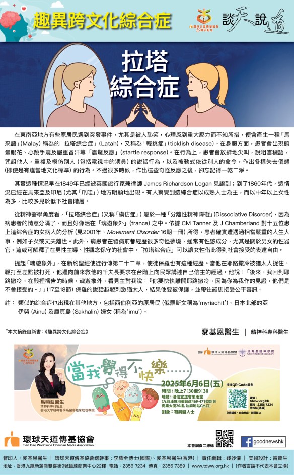 註:類似「拉塔」的綜合症也出現在其他地方,包括西伯利亞的原居民(俄羅斯文稱為‘myriachit’)、日本北部的亞伊努(Ainu)及庫頁島(Sakhalin)婦女(稱為‘imu’)。
