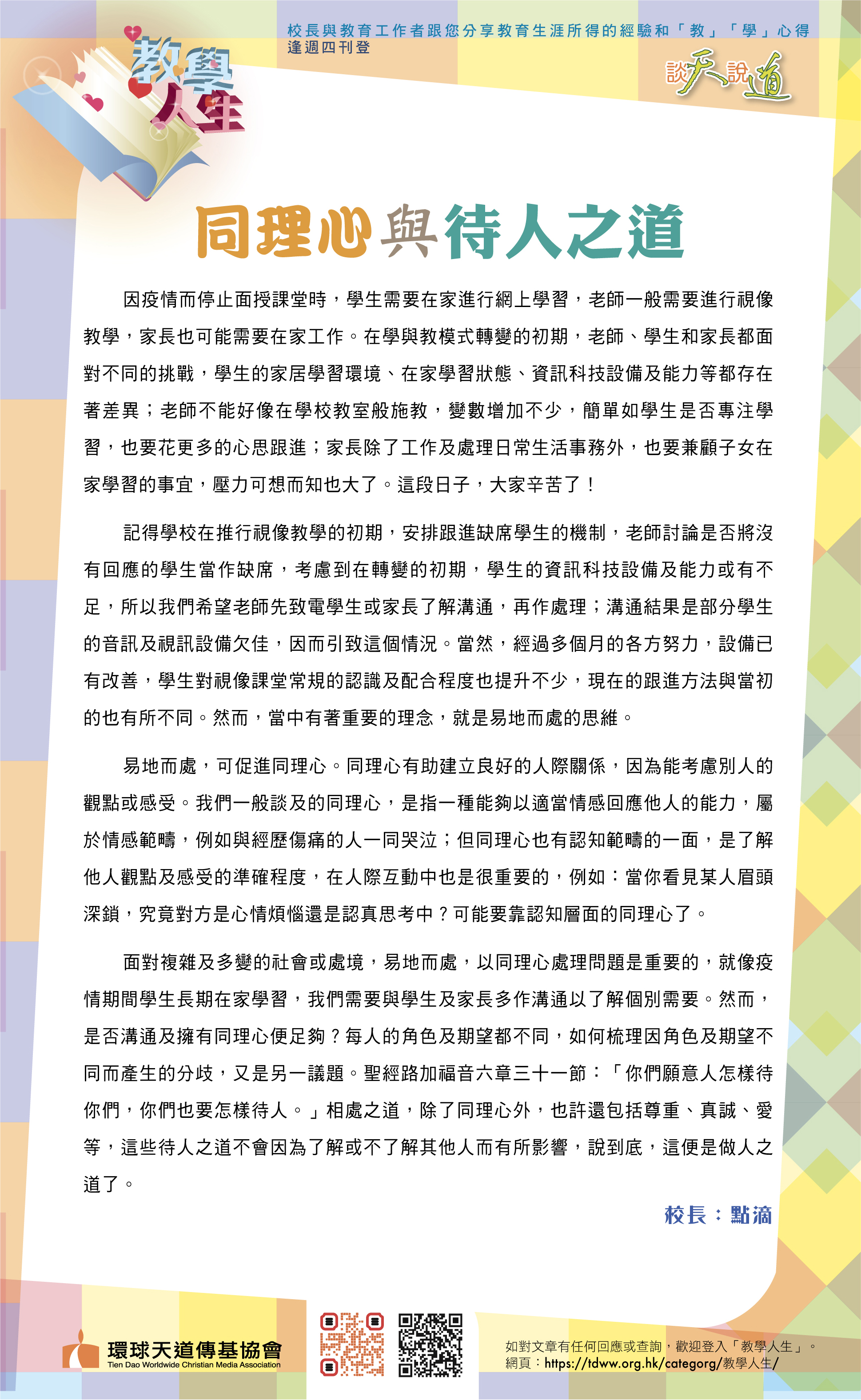 某日在教員室門外遇到兩位學生,他們想找老師問一些學科問題,剛巧老師不在。我看見他們的問題屬於我之前任教的學科,於是向他們解說,他們明白後展露了愉悅的表情,並向我致謝。做了校長一段日子,那一刻我突然感受到久違了的教學滿足感。
