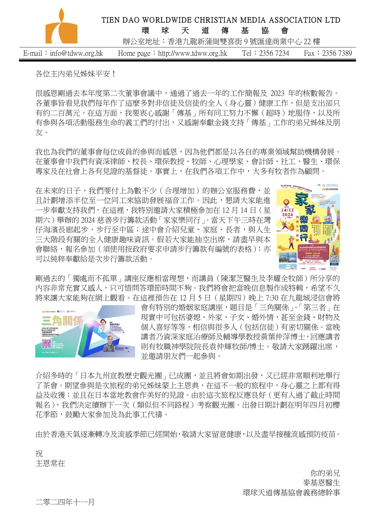 為支援家庭輔導、關懷長者需要等事工籌募經費