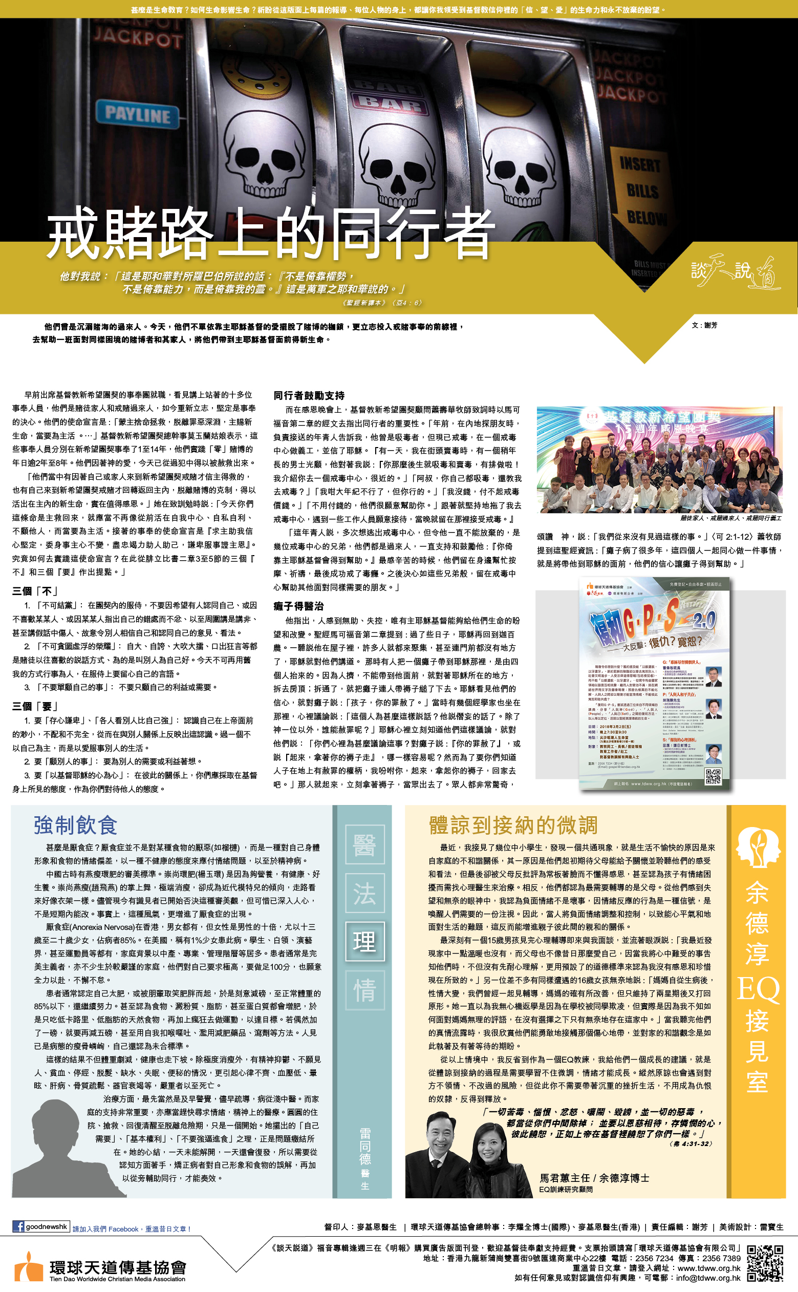 他們曾是沉溺賭海的過來人。今天,他們不單依靠主耶穌基督的愛擺脫了賭博的枷鎖,更立志投入戒賭事奉的前線裡,去幫助一班面對同樣困境的賭博者和其家人,將他們帶到主耶穌基督面前得新生命。