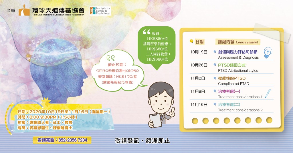 報名按此本課程主要是講解創傷治療中一些實務工作,處理方法等。讓學員能掌握到創傷治療當中重要元素,為將來成為專業助人者所俱備的知識,作好準備。